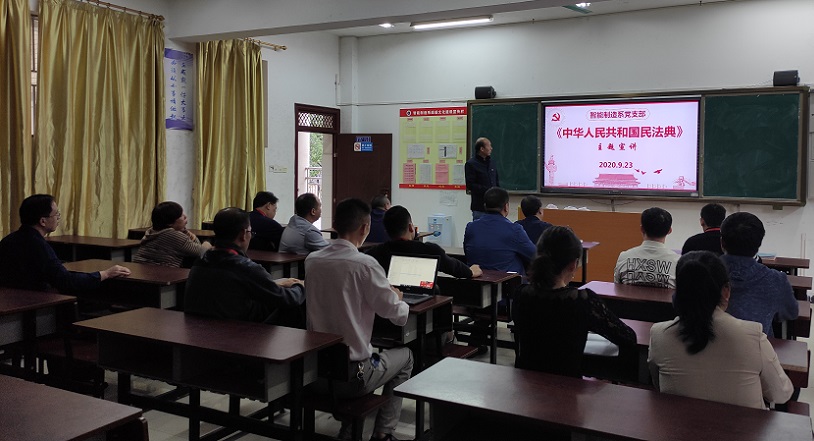 (通讯员 张俊召)9月23日下午,智能制造系党支部在教学楼209教室开展主题党日活动,专题宣讲《习近平谈治国理政》(第三卷)和《中华人民共和国民法典》。宣讲活动由支部书记李会亮组织,全体党员参加学习。