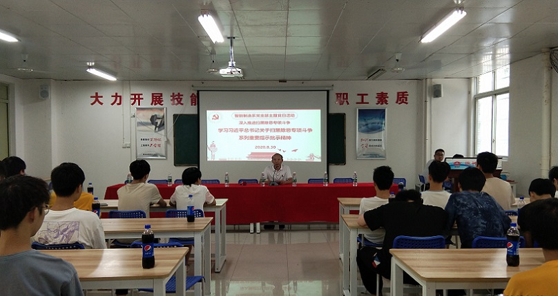 在炬神电子员工培训中心,系主任段盛琦对同学们在企业实践中的良好表现进行了表扬,对存在的不足进行了点评,勉励同学们把握在企业的锻炼学习机会,体验企业文化,遵守管理制度,培养吃苦耐劳精神,提高综合素质,树立学习目标,为将来正式走上工作岗位打下坚实的思想和职业素养基础。支部书记李会亮向全体党员、带队班主任及同学们传达学习了习近平总书记关于扫黑除恶专项斗争系列重要指示批示以及党中央、省委、市委扫黑除恶专项斗争工作部署有关精神,鼓励大家积极参与全市扫黑除恶百日攻坚战,组织与会人员观看了“扫黑除恶”微视频宣传片。接着,支部书记李会亮又作了以“关爱未成年人健康成长”为主题的专题讲座。从“做遵纪守法公民”、“注意安全,珍爱生命”和“保持阳光心态,积极面对人生”三个方面与同学们进行了分享。会议由系主任段盛琦主持并总结,企业人事部经理唐俊峰应邀出席会议并作讲话。