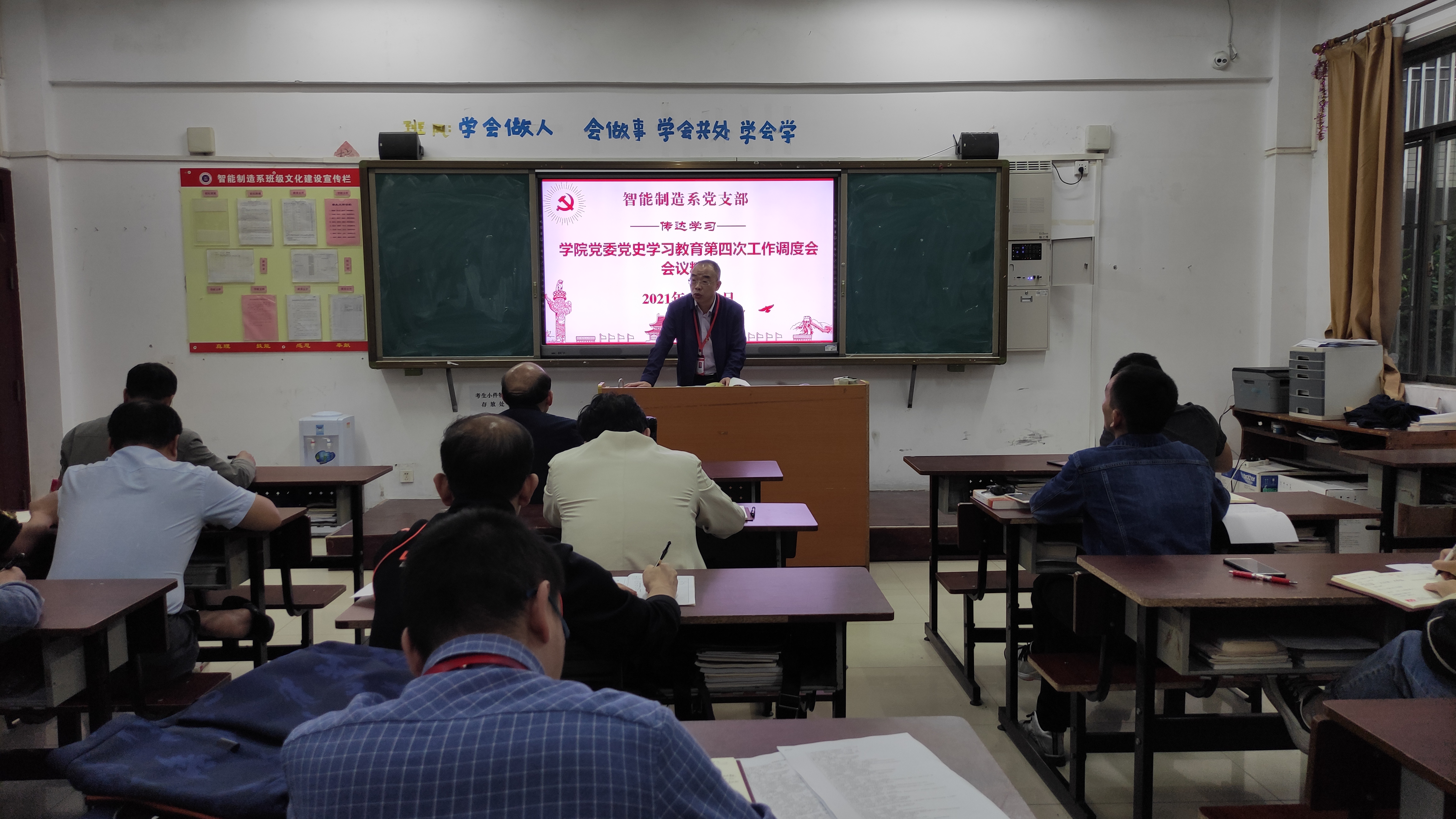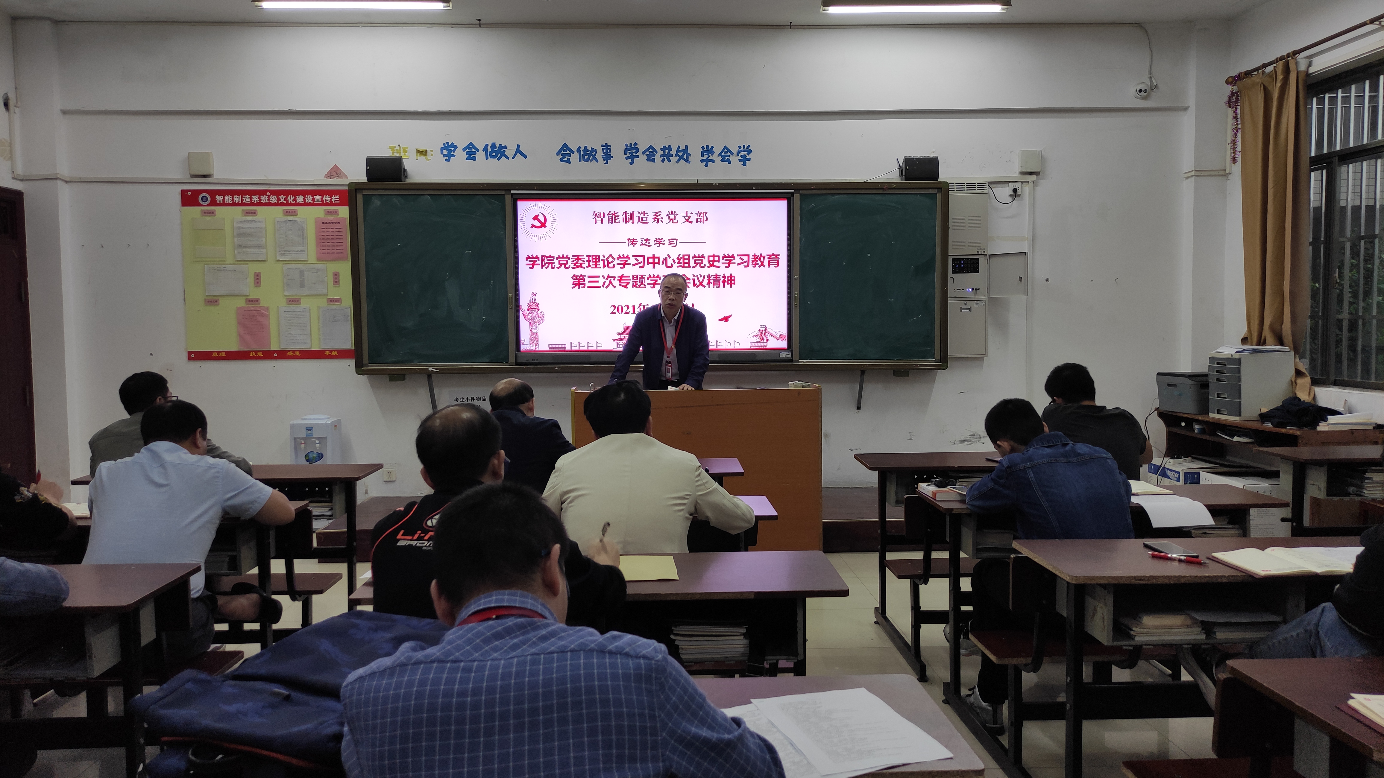 段盛琦首先传达了学院党委理论学习中心组党史学习教育第三次专题学习会议精神和学院党委党史学习教育第四次工作调度会会议精神。支部宣传委员张俊召领学了对《关于若干历史问题的决议》草案的说明、对起草《关于建国以来党的若干历史问题的决议》和习近平在全国职业教育工作会议上的重要指示精神。