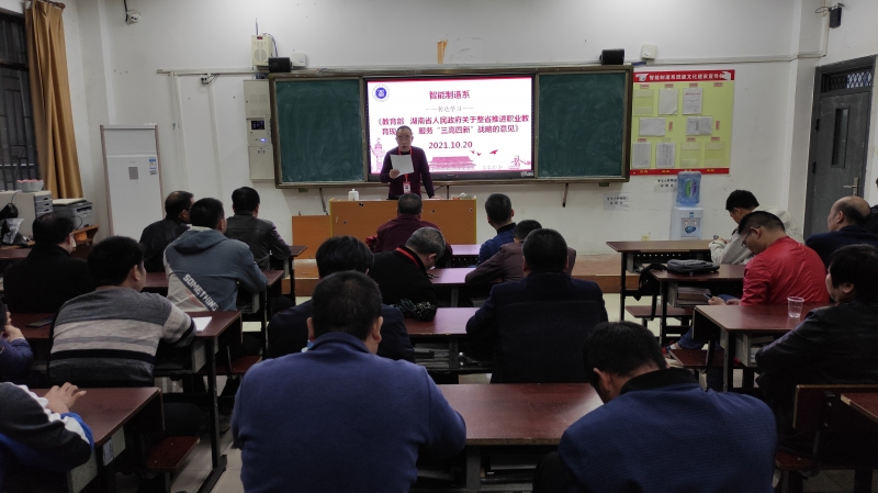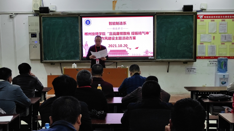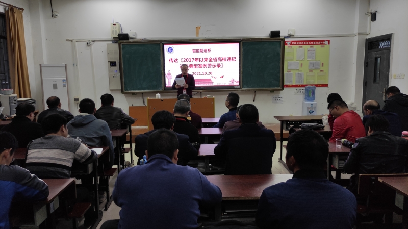(通讯员 张俊召)10月20日下午,智能制造系召开全体教职工大会,根据我系工作实际,结合学院作风建设主题活动和对我系校内巡察情况的意见反馈,开展专题学习教育。会议由系主任段盛琦主持并领学,全体教职工参加会议。